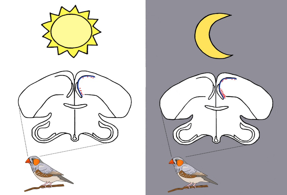 Nové neuróny vznikajú v mozgu u mladých aj dospelých jedincov. Ich tvorba je ovplyvnená mnohými faktormi, vrátane fyzickej aktivity alebo cirkadiánneho systému synchronizovaného svetlom. Neurogenéza u laboratórnych hlodavcov je najvyššia v tmavej fáze dňa, podobne ako ich aktivita. U živočíchov aktívnych počas svetlej fázy dňa však nie je známe, či tvorba nových buniek v mozgu má denný rytmus a kedy vrcholí. V tejto štúdii sme u dospelých jedincov spevavca zebričky červenozobej (Taeniopygia guttata) zistili, že expresia mRNA hodinových génov ukazuje cirkadiánny rytmus, ale tvorba nových buniek v celom mozgu neukazovala rytmus. Avšak v „hot spot“ oblasti, to znamená oblasti najintenzívnejšieho bunkového delenia, mala tvorba nových buniek rytmickú aktivitu s periódou 24h s maximom na začiatku tmavej fázy. Expresia apoptických génov neukazovala rytmický priebeh. Táto štúdia má význam pre pochopenie mechanizmov regulácie vzniku nových buniek v mozgu u rôznych druhov, vrátane človeka.