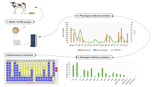 Rezistencia čeľade Enterobacterales na karbapenémy, fluórochinolóny a polymyxíny je kľúčovým bodom koncepcie WHO v boji proti antimikrobiálnej rezistencii. V humánnej medicíne predstavujú karbapenémy „poslednú voľbu“ pri liečbe multirezistentných infekcií, vo veterinárnej sfére sú zakázané. Napriek tomu dochádza k nárastu karbapeném-rezistentných kmeňov v dôsledku „ko-selekcie“ podmienenej nadmerným používaním iných β-laktámových antibiotík. V štúdií sme sa zamerali na posúdenie antibiotickej rezistencie Escherichia coli izolovaných z hnačkujúcich teliat. Vysoká miera rezistencie bola zaznamenaná voči penicilínom a tetracyklínu, fluórochinolónom, sulfonamidom a aminoglykozidom. 71 % izolátov vykazovalo multirezistenciu. Znepokojivý je ojedinelý výskyt rezistencie voči cefalosporínom 4. generácie a ertapenému (karbapenémy). Prítomnosť mobilných elementov (int1, tn3) ako aj génov blaCMY-2, blaCTX-M-1, blaCTX-M-2 a blaCTX-M-9, potvrdzuje potenciál pre horizontálne šírenie rezistencie.