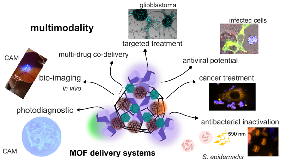 Súbor publikovaných prác sa venuje syntéze a charakteristike povrchovo modifikovaných kovovo-organických sietí (MOF) ako multifunkčných nanonosičov liečiv. MIL-101(Al)–NH? bol použitý na prenos hypericínu, známeho antivírusového a antibakteriálneho činidla. Komplex inhiboval interakcie proteínu SARS-CoV-2 s ACE2 receptormi, vykazoval antibakteriálnu aktivitu a mal imunostimulačný efekt, ktorý vykazuje samotný MOF. V in vitro bakteriálnom a ex ovo modeli bakteriálnej infekcie na chorioalantoickej membráne prepeličieho embrya bola demonštrovaná možnosť doručenia antibiotika a fotosenzibilizátora pre prekonanie bakteriálnej rezistencie využitím fotodynamickej terapie. MOF je možné funkčne modifikovať (UiO-66 nanočastice+histidín) v systéme pre cielené podávanie 5-fluorouracilu do nádorových buniek. Výsledky zdôrazňujú MOF ako perspektívne nanoplatformy pre multimodálnu terapiu – antivírusovú, antibakteriálnu, imunomodulačnú a cielenú chemoterapiu, či fotodynamickú terapiu.