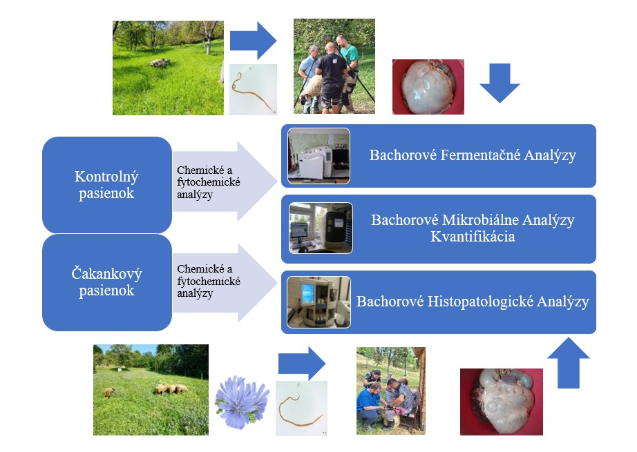 V prirodzených lúčnych a pasienkových ekosystémoch sa vyskytuje bohatá druhová diverzita rastlín, ktoré predstavujú významný zdroj živín pre pasúce sa prežúvavce. Cieľom štúdie bolo hodnotiť bachorové prostredie jahniat s endoparazitmi pasených na lúčnych pastvinách obohatených o experimentálne zasiatu čakanku (Cichorium intybus). Jahňatá infikované larvami endoparazita Haemonchus contortus boli rozdelené do dvoch skupín: pasené na druhovo bohatom lúčnom pasienku a na pasienku rekultivovanom čakankou. Priemerná počiatočná hmotnosť jahniat bola v oboch skupinách porovnateľná do 62. dňa po infekcii, pričom od 89. dňa po infekcii bola zaznamenaná signifikantne vyššia hmotnosť jahniat v čakankovej skupine. Výsledky potvrdili priaznivé nutričné vlastnosti čakanky, ktoré sa prejavili zmenami bachorovej mikrobioty a aktivity hydroláz, zvýšením koncentrácie amoniakálneho dusíka a zlepšením využitia živín, čo pozitívne ovplyvnilo výživový stav a pohodu parazitárne zaťažených jahniat.
