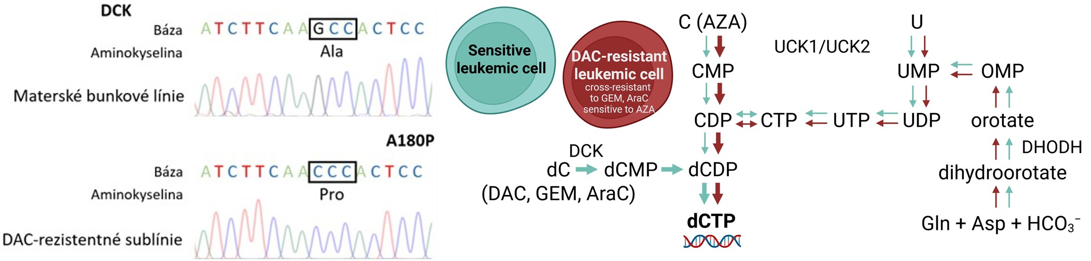 Liečivá decitabín (DAC) a azacitidín (AZA) zlepšujú prežívanie starších pacientov s vysokorizikovým myelodysplastickým syndrómom a akútnou myeloidnou leukémiou, no pri ich opakovanom podávaní sa často rozvinie rezistencia. V predchádzajúcej štúdii sme ukázali, že rezistencia na AZA je často sprevádzaná zníženou účinnosťou DAC. Naopak, naše výsledky na bunkových líniách naznačujú, že bunky rezistentné na DAC si väčšinou zachovávajú citlivosť na AZA. V modeloch rezistencie na DAC sme identifikovali novú mutáciu v enzýme deoxycytidínkináza, ktorá vedie k jeho rýchlej degradácii a znemožňuje aktiváciu DAC, pričom AZA tento enzým nevyužíva. Výsledky naznačujú, že poradie podávania týchto liečiv môže zásadne ovplyvniť účinnosť liečby. Keďže v klinických štúdiách liečba často začína AZA a následne sa prechádza na DAC, môže to viesť k neúčinnosti ďalšej terapie. Navrhujeme preto skúmať aj opačné poradie liečby. DAC sa však zatiaľ v slovenskom zdravotníctve nepoužíva, hoci je schválený EMA.